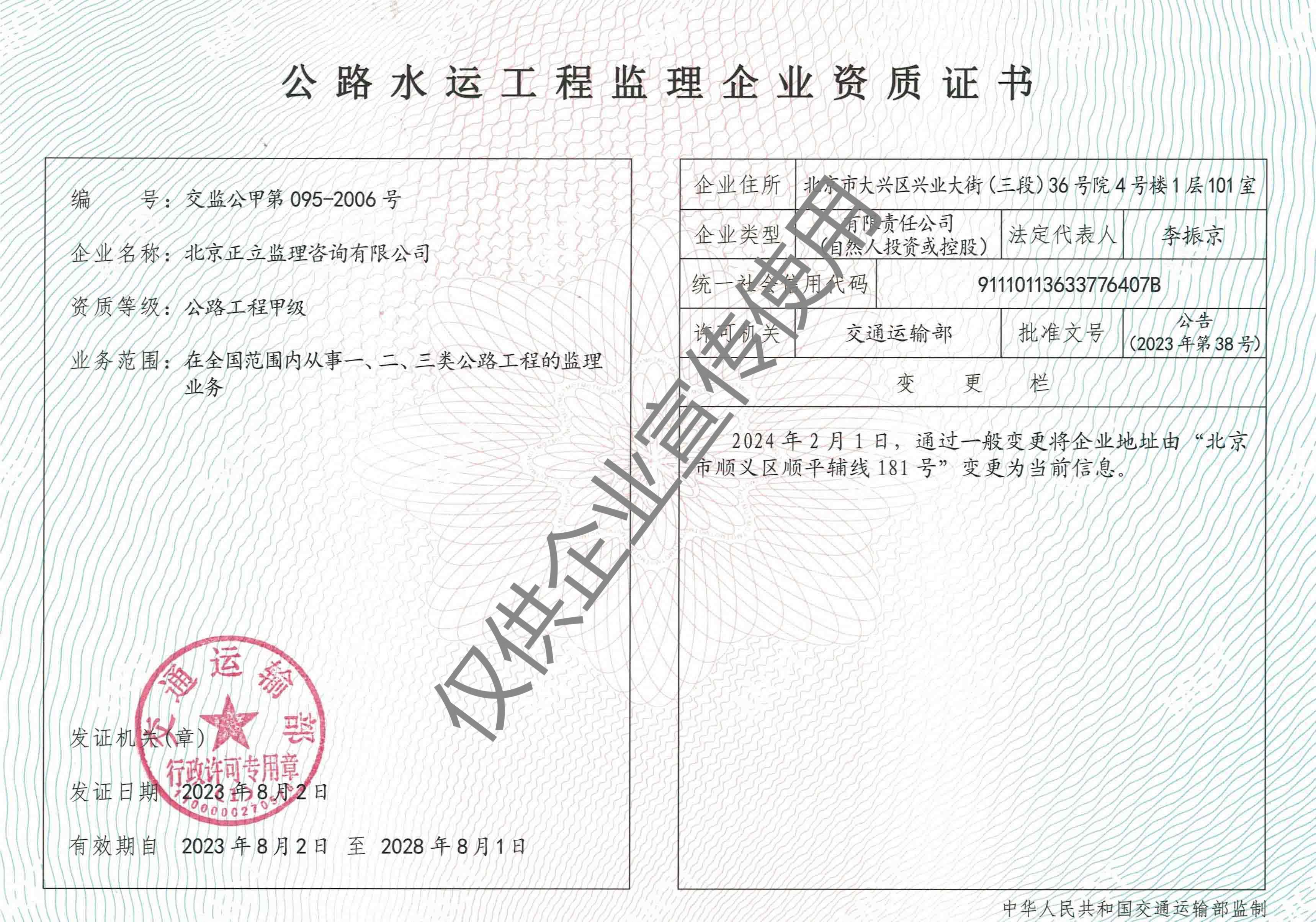 北京正立監(jiān)理咨詢有限公司成立于1998年7月1日,其前身隸屬于北京市公路質(zhì)量監(jiān)理站。具有獨立法人資格,是獨立核算、自負盈虧的經(jīng)濟實體。企業(yè)經(jīng)營范圍:公路工程監(jiān)理、交通工程監(jiān)理、市政公用工程建設(shè)監(jiān)理、工業(yè)與民用建筑工程監(jiān)理、工程監(jiān)理咨詢、技術(shù)咨詢、技術(shù)培訓等。